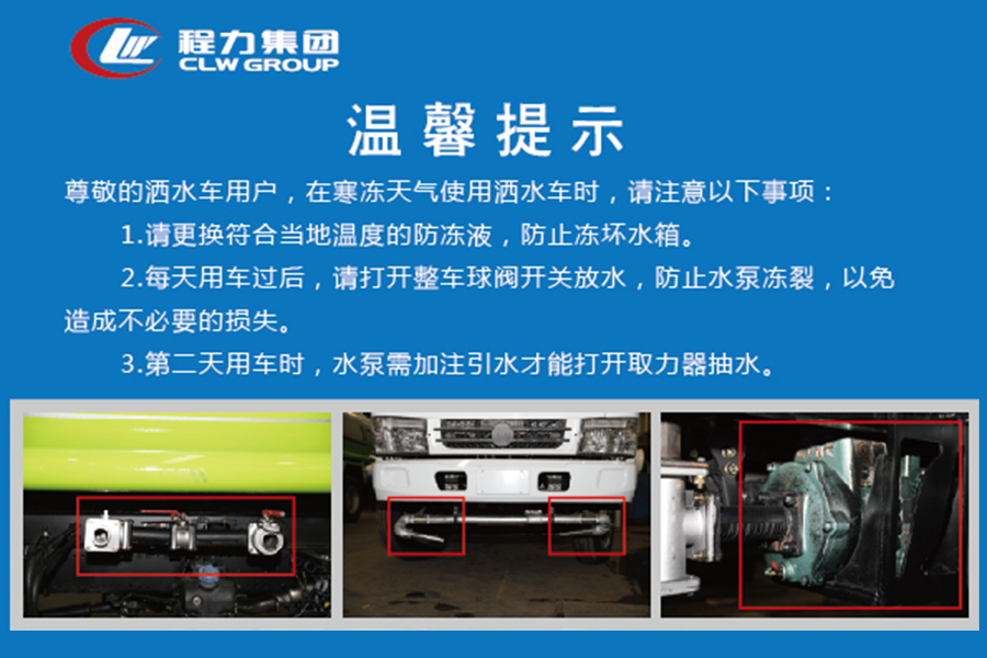 进入24节气的冬至了,在这个天寒地冻的天,也是多功能抑尘车和洒水车水泵故障的高发期,之所以水泵会坏,不仅是因为寒冷的天气还有我们在用车的过程中对车辆日常保养的忽略造成的,那么今天程力环卫车厂家来告诉你,带水泵的抑尘车和洒水车在冬天应该注意些什么,怎样才能避免造成不必要的损失。...