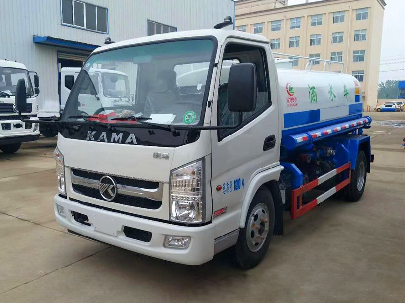 上装配置:凯马5吨洒水车罐体容积5立方米,罐体采用4mm碳钢板一次卷压成型,无缝焊接。罐内设防波隔板,车辆运载更平稳安全。独有烤漆工艺,防腐除锈,多层底漆、面漆喷涂。洒水车水泵垂直吸程≧7米,前冲洒水宽度≧16米。洒水车配备:大功率水泵,洒水车前冲(喷)后洒,带侧喷,带65消防接口,后平台带高压水炮不带门,前封头带水位计,后平台主管路带1寸浇花接口,后爬梯,配3米长抽水钢丝塑料管两根,用于抽水作业使用;罐后带工作平台,平台上带安全护栏和高位绿化洒水炮一个,洒水炮可全方位360度旋转,可连续调成直冲状、大雨、小雨、毛毛雨等不同喷洒方式,调成直冲状射程长度≥28m、高度≥12m,调成细雨状射程宽度≥15m。功能齐全,灌溉、喷洒、道路养护,喷雾降尘、高炮喷射等,采用优质水泵,合理设计水路管道,气控取力器,作业能力强。配备国内大功率洒水车专用水泵,可自吸自排,引水时间<15min,流量40m3/h,扬程35米,另可加装雾炮喷洒30-35米