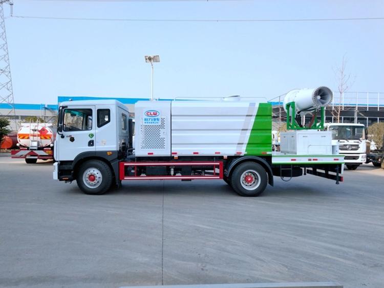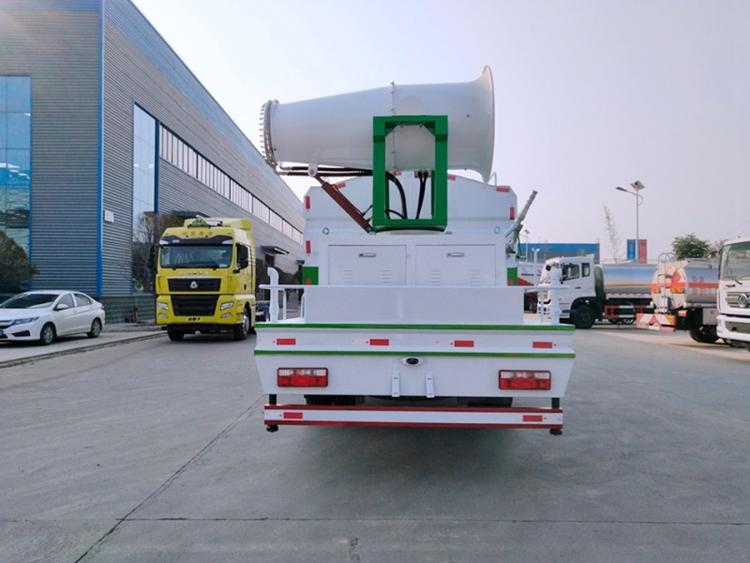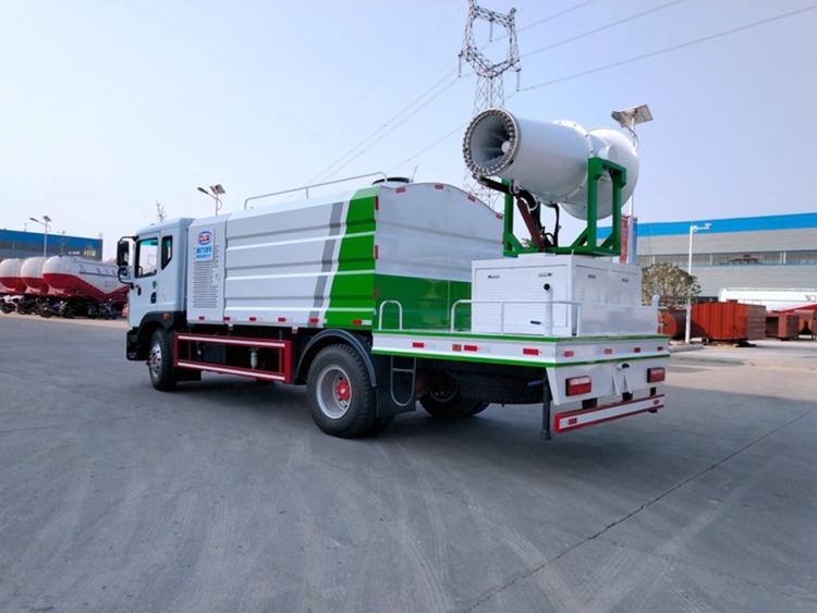 罐体采用4mm厚碳钢板制作,罐体容积12吨,配备大功率专用洒水泵。前冲(喷)后洒,带侧喷,后置工作平台,平台上安装绿化洒水高压炮(炮喷射形状可调成直冲状、大雨、中雨、毛毛雨、炮可360度旋转,射程≧25米)。带自流阀,消防接口。带自吸泵,可抽水或从消防栓上连接注水。罐体前部安装大功率柴油发电机组,后置25-120米大型雾炮喷雾机组。