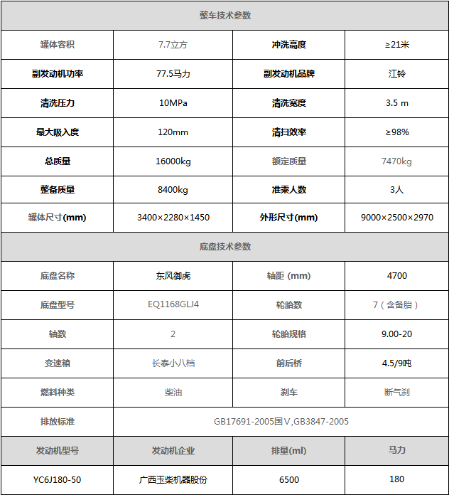 东风御虎高压清洗车 采用东风御虎底盘,白色排半可前翻驾驶室,康明斯180马力国五发动机,长泰小八档变速箱,轴距4500mm,9吨后桥,9.00-20轮胎,原厂abs,带方向助力,离合助力器,气刹制动。