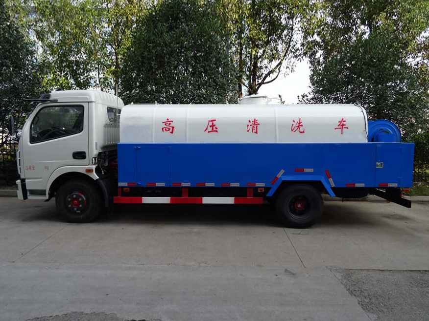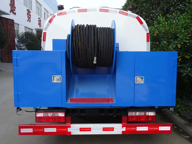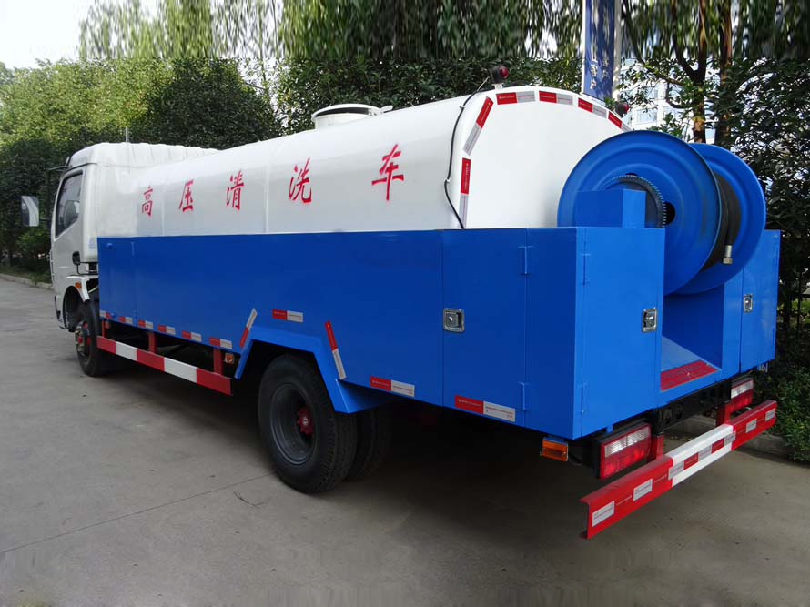 罐体材质为优质武钢板材,严格按照国家公告生产,罐体容积大储水量多,可以进行连续清洗、疏通。配置天津通洁或意大利进口高压水泵,性能稳定,清洗、疏通效果好。耐压胶管可选60-120米长度,卷管力1800N 、胶管内径φ19 mm 、卷管速度为0-30米、推进力≥180 N 。采用变速箱夹心取力技术,功率损耗接近为零,且噪音小;取力器开启,为驾驶室气动操作,减轻了操作人员的劳动强度。油泵、油马达、多路阀等配件均选用国内名牌产品。可加装洒水装置,安装绿化洒水炮、前冲、后洒、侧喷,可进行绿化洒水、喷雾、压尘、高压冲洗路面等。具有压力高、节约水、作业时间长、清洗效果好的特点。还可加装吸污功能,集清洗、吸污于一体。
