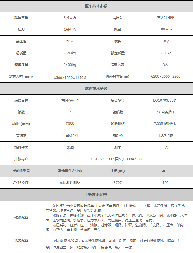 东风多利卡高压清洗车上装配置:
