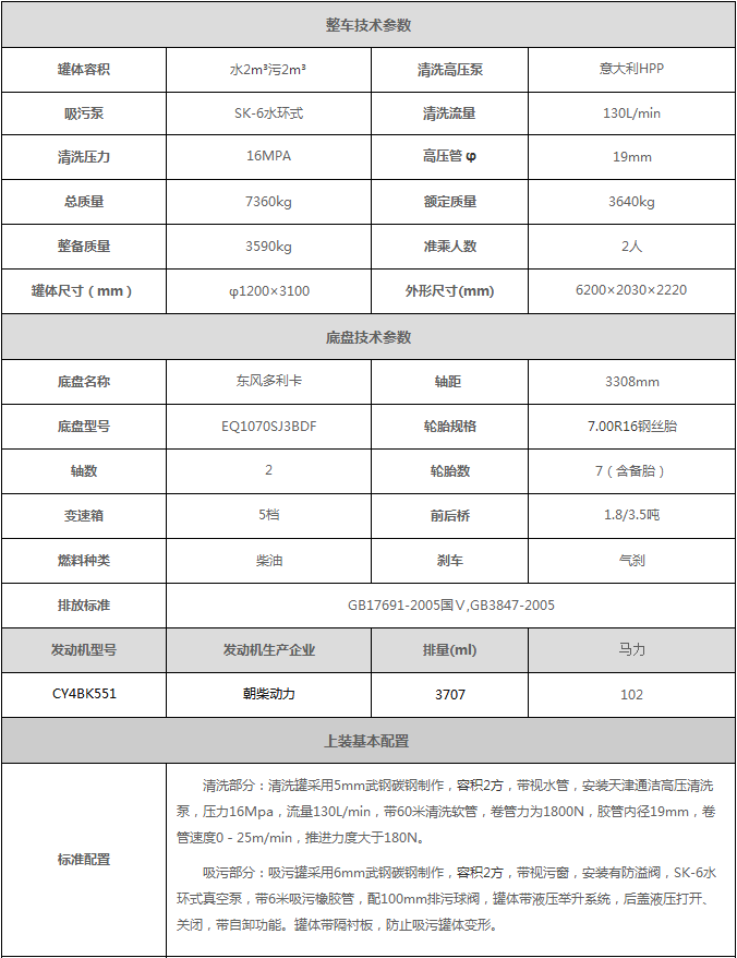 东风小多利卡高压清洗车采用多利卡底盘,朝柴CY4BK551 国五排放发动机,单排可翻转车身,192前后变截车架,5档变速箱,750R16轮胎,ABS,断气刹,方向助力。