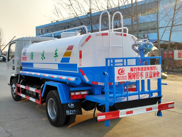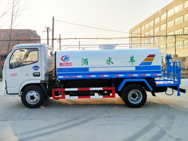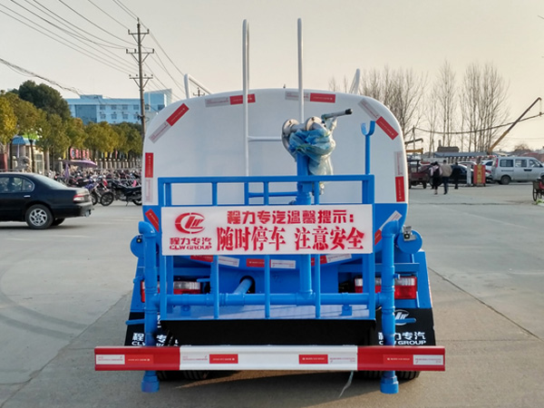 东风凯普特5吨洒水车罐体采用4mm厚碳钢板制作,罐体容积5立方米,罐内设防浪隔板,防浪防荡,配备大功率专用洒水泵。前冲(喷)后洒,带侧喷,后置工作平台,平台上安装绿化洒水高压炮(炮喷射形状可调成直冲状、大雨、中雨、毛毛雨、炮可360度旋转,射程≧25米)。带自流阀,消防接口。带自吸泵,可抽水或从消防栓上连接注水。