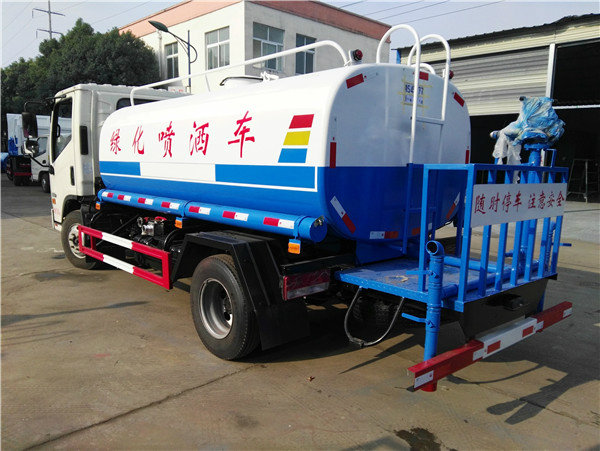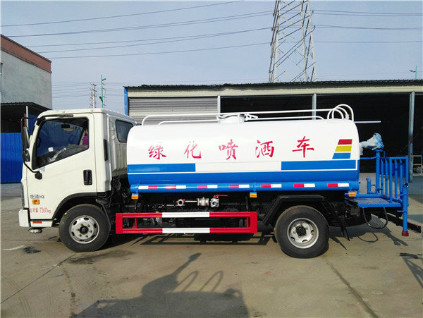 福田康瑞5吨洒水车,罐体容积5立方米,封头厚5mm,罐体采用4mm武钢优质碳钢,一次性卷压成型,无缝焊接。罐体通过高压气体试漏检测,罐内设防浪隔板,防浪防荡,车辆运载安全平稳。洒水车配备大功率专用洒水泵,自吸自排,水流量为90立方/小时,洒水车自吸高度为7米。