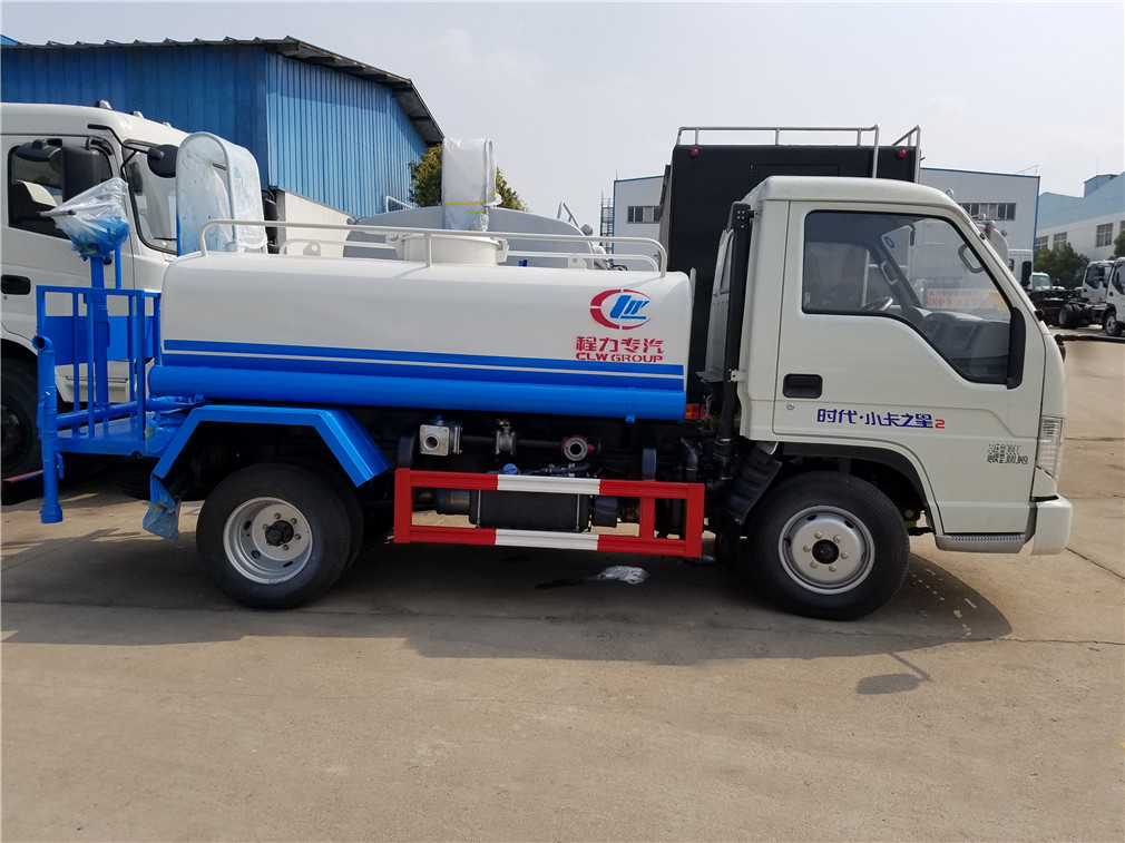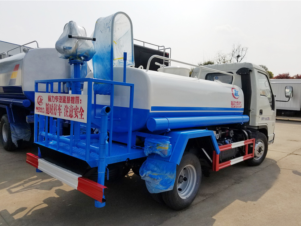 【洒水车标配】前冲、后洒、侧喷、消防接口、自流阀、尾部工作平台、平台高压水炮等,洒水车最大洒水宽度14米,最大射程28米,平台高压水炮可360度旋转,可调成直冲伏、大雨、中雨、小雨、毛毛雨等不同喷射形状,柱状最大射程28米,雾状最大射程15米,用于远程浇灌,冲洗高大树木,配备消防接口,可用于应急消防工作。
