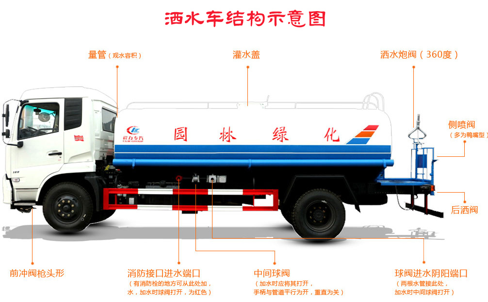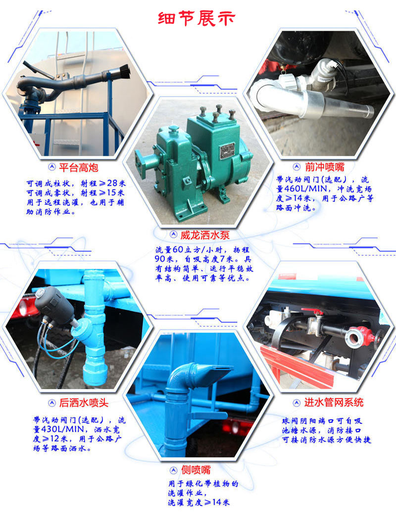 【洒水车标配】前冲、后洒、侧喷,高位侧花洒、尾部工作平台、高压水炮等,洒水车最大洒水宽度14米,水炮可360度旋转,可调节成直冲撞、大雨、中雨、小雨、毛毛雨等不同状态,柱状最大射程为28米,雾状最大射程为15米,用于公路洒水,园林浇灌,冲洗高大树木等。洒水车还配备了消防接口,可用于紧急消防工作。