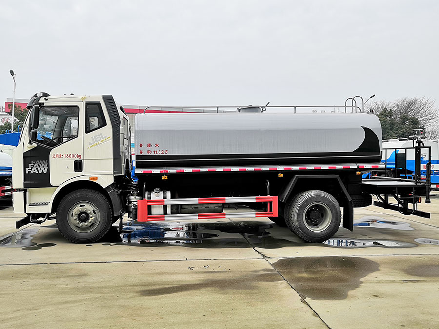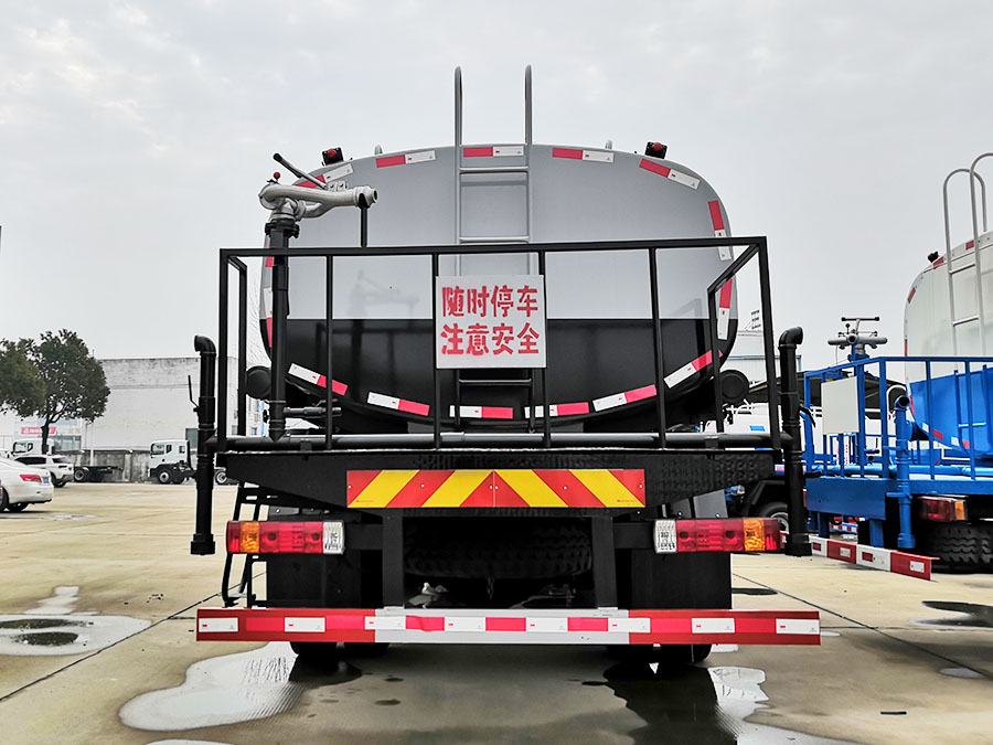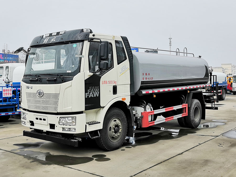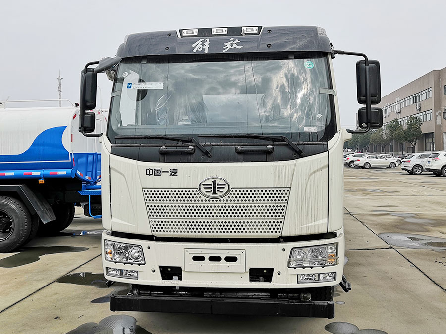 解放J6洒水车,罐体容积12立方米,封头厚度5mm,罐体采用4mm武钢优质碳钢,一次性卷压成型,无缝焊接。罐体通过高压气体试漏检测,罐内设防浪隔板,防浪防荡,车辆运载安全平稳。洒水车配备大功率专用洒水泵,自吸自排,水流量为90立方/小时,洒水车自吸高度为7米。