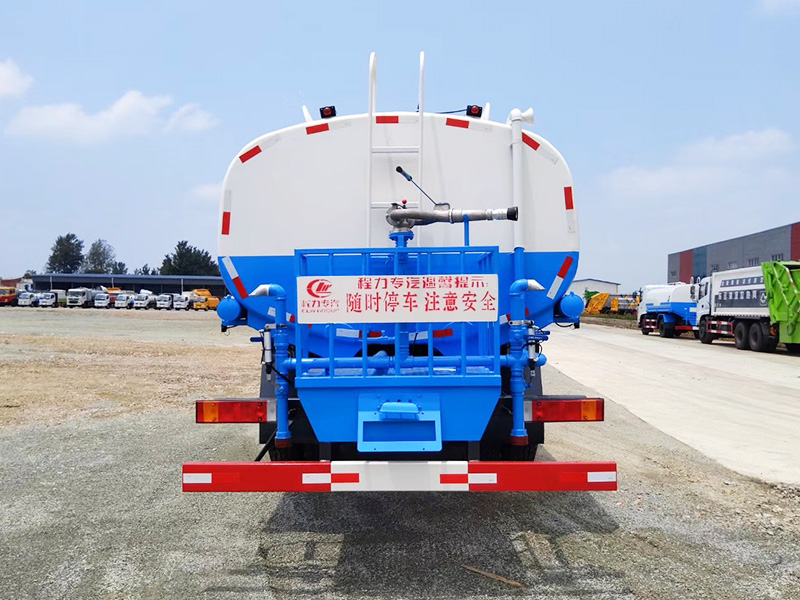 【洒水车标配】前冲、后洒、侧喷,高位侧花洒、尾部工作平台、高压水炮等,洒水车最大洒水宽度15米,水炮可360度旋转,可调节成直冲撞、大雨、中雨、小雨、毛毛雨等不同状态,柱状最大射程为30米,雾状最大射程为15米,用于公路洒水,园林浇灌,冲洗高大树木等。洒水车还配备了消防接口,可用于紧急消防工作。