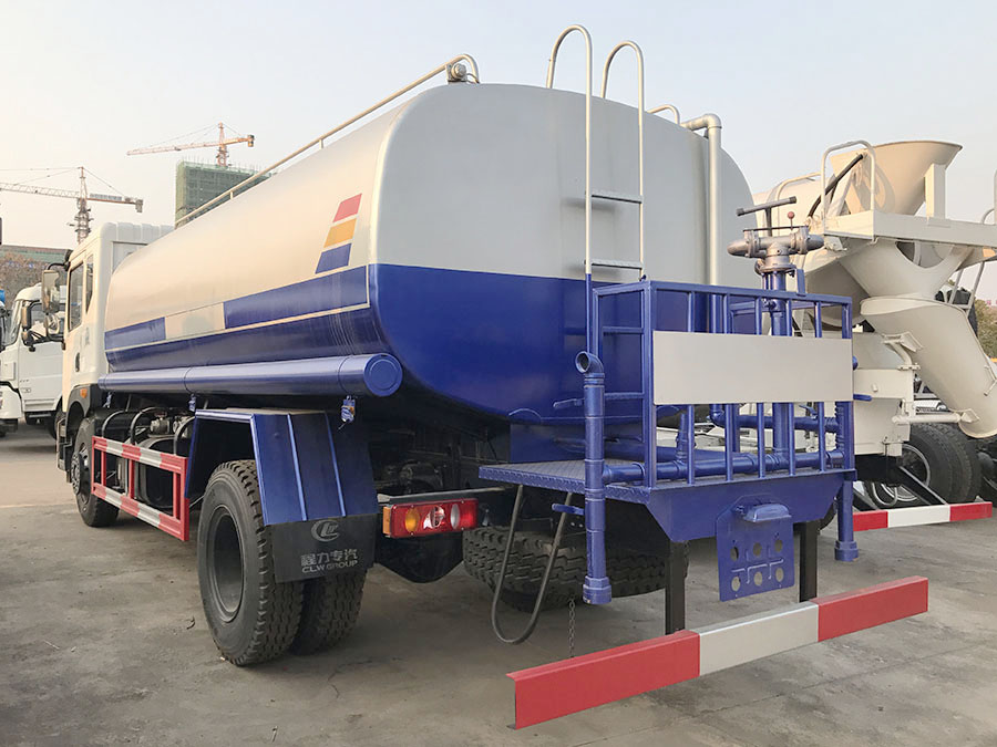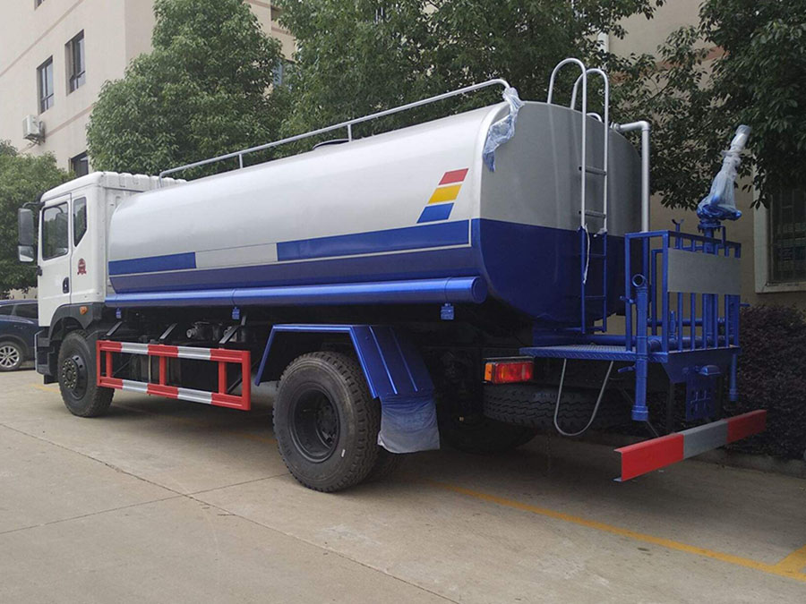 15吨东风御虎T5洒水车,罐体容积15立方米,封头厚度5mm,罐体采用4mm武钢优质碳钢,一次性卷压成型,无缝焊接。罐体通过高压气体试漏检测,罐内设防浪隔板,防浪防荡,车辆运载安全平稳。洒水车配备大功率专用洒水泵,自吸自排,水流量为90立方/小时,洒水车自吸高度为7米。