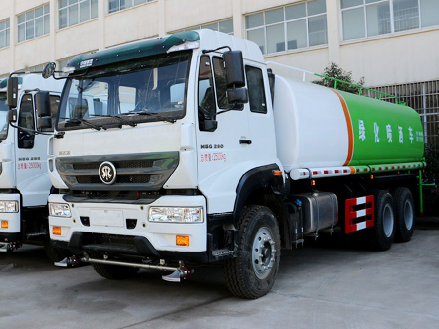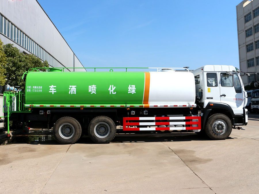 重汽斯太尔20吨洒水车罐体容积20立方米,封头厚度5mm,罐体采用4mm武钢优质碳钢,一次性卷压成型,无缝焊接。罐体通过高压气体试漏检测,罐内设防浪隔板,防浪防荡,车辆运载安全平稳。洒水车配备大功率专用洒水泵,自吸自排,水流量为90立方/小时,洒水车自吸高度为7米。