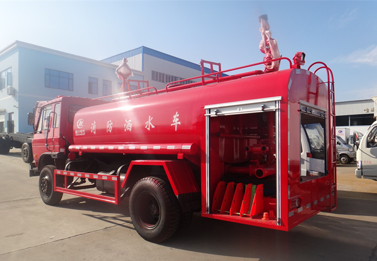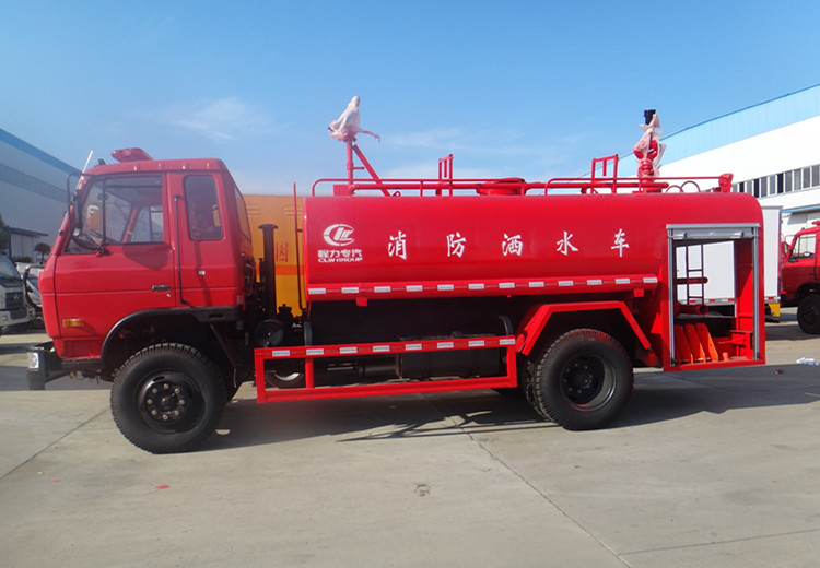 罐体容积为8-10立方,罐体材质为4mm碳钢Q235材质,罐内隔板具有防波作用,以减轻汽车行驶时罐体液体冲击,罐体及整车外形尺寸严格按照公告制作。带大功率专用洒水泵,泵可自吸自排,整车前冲、后洒、侧喷、带65消防接口,前封头带水位计,罐体一侧带爬梯。带两根水管及阴阳端。罐体上可选配带绿化洒水炮,洒水炮可全方位旋转,可连续调成直冲状、大雨、小雨、毛毛雨罐体颜色:上白/下蓝或太阳红,罐体两侧喷“洒水车、消防洒水车”字样,贴反光标示;消防洒水车一车两用,即可用作消防车,同时用于绿化洒水车,需要时还可作喷药车使用,是一款多功能型消防车。