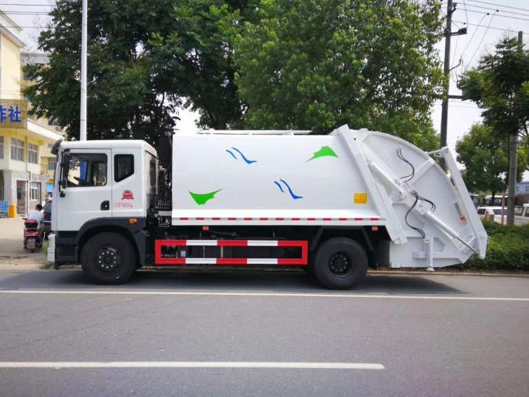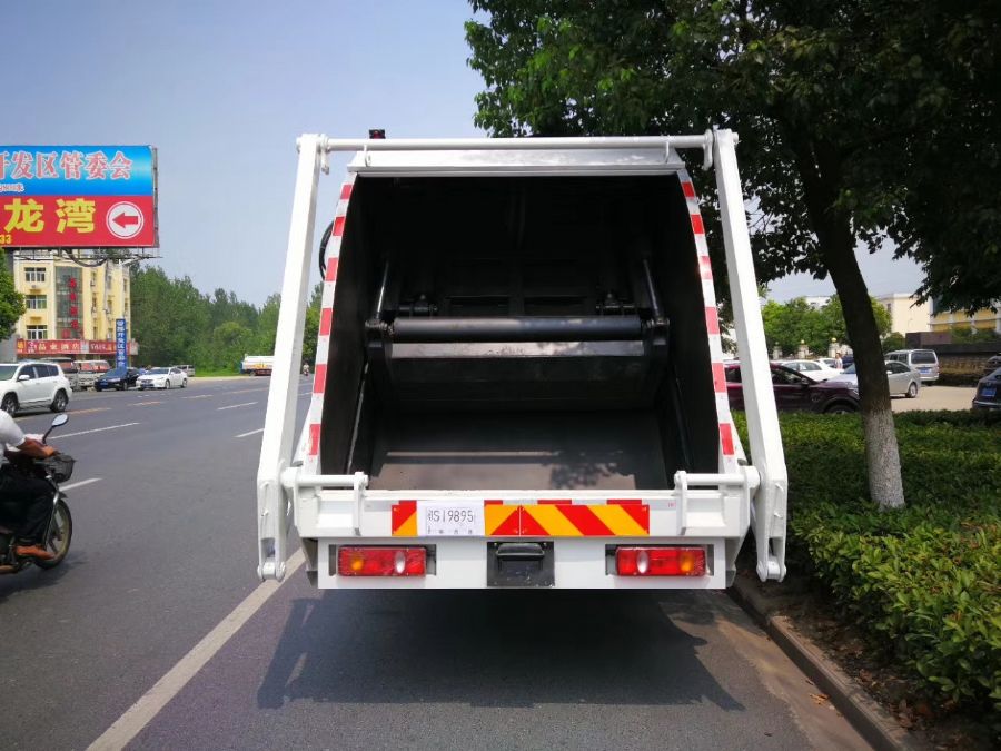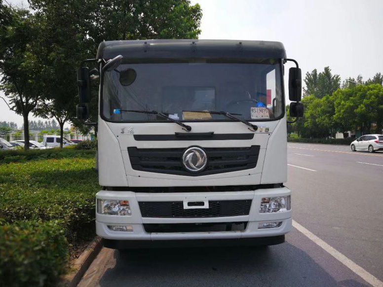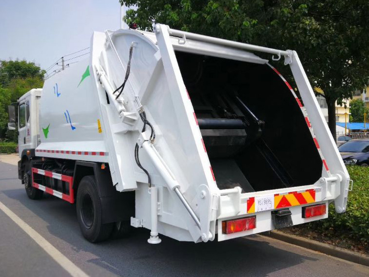 12方东风T5压缩式垃圾车,弧形箱体,容积约12-14立方,可装垃圾10-12吨,采用特种钢板制作,箱体底板5mm,边板5mm,厦门银华油缸,江苏多路阀,长源液压油泵,填装器举升油缸带液压锁装置,采用进口西门子PLC电控系统(带一键操作,和手动操作两种控制方式),电控操作盒三只。带3个污水收集箱,尾部带橡胶密封条。填充器加装后照明灯,箱体油漆及喷字可按用户要求定制。