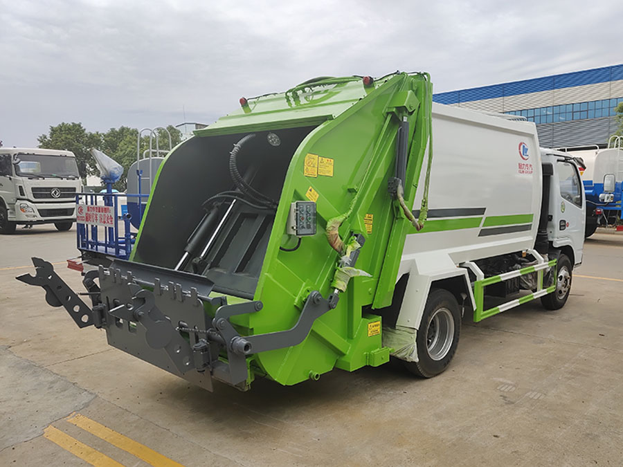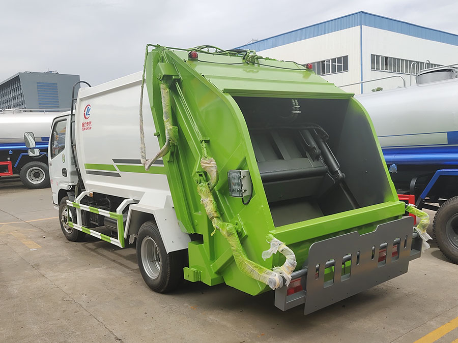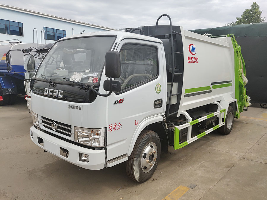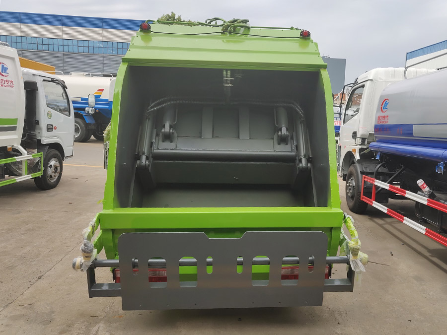 东风多利卡6方压缩式垃圾车,弧形箱体,容积约6立方,可装垃圾4.5吨,采用特种钢板制作,箱体底板4mm,边板4mm,厦门银华油缸,江苏多路阀,长源液压油泵,填装器举升油缸带液压锁装置,采用进口西门子PLC电控系统(带一键操作,和手动操作两种控制方式),电控操作盒三只。带2个污水收集箱,尾部带橡胶密封条。填充器加装后照明灯,箱体油漆及喷字按用户要求定制。