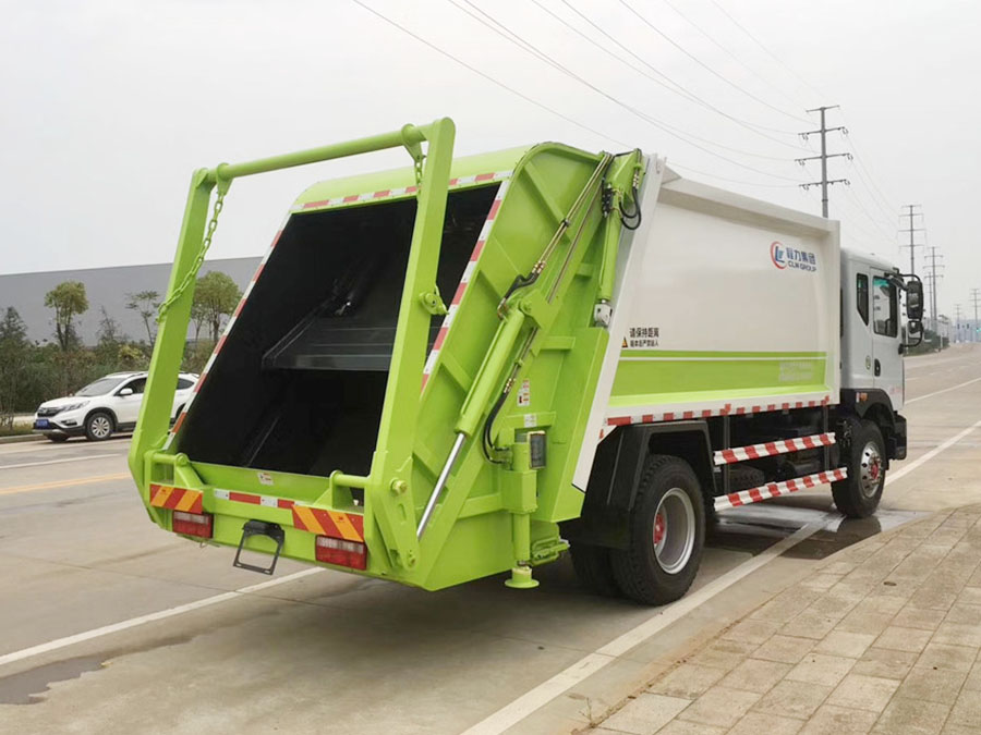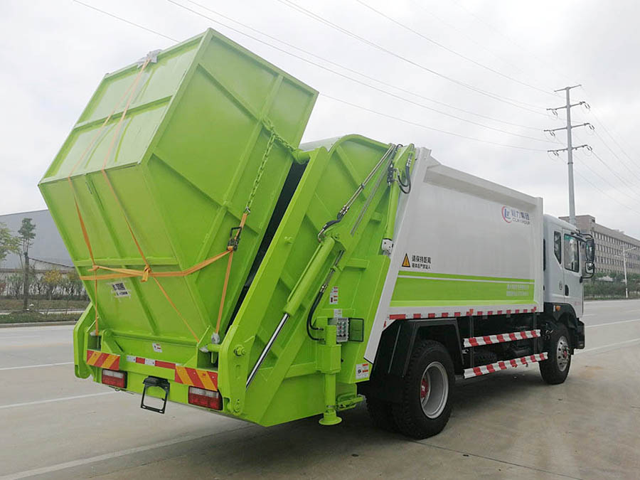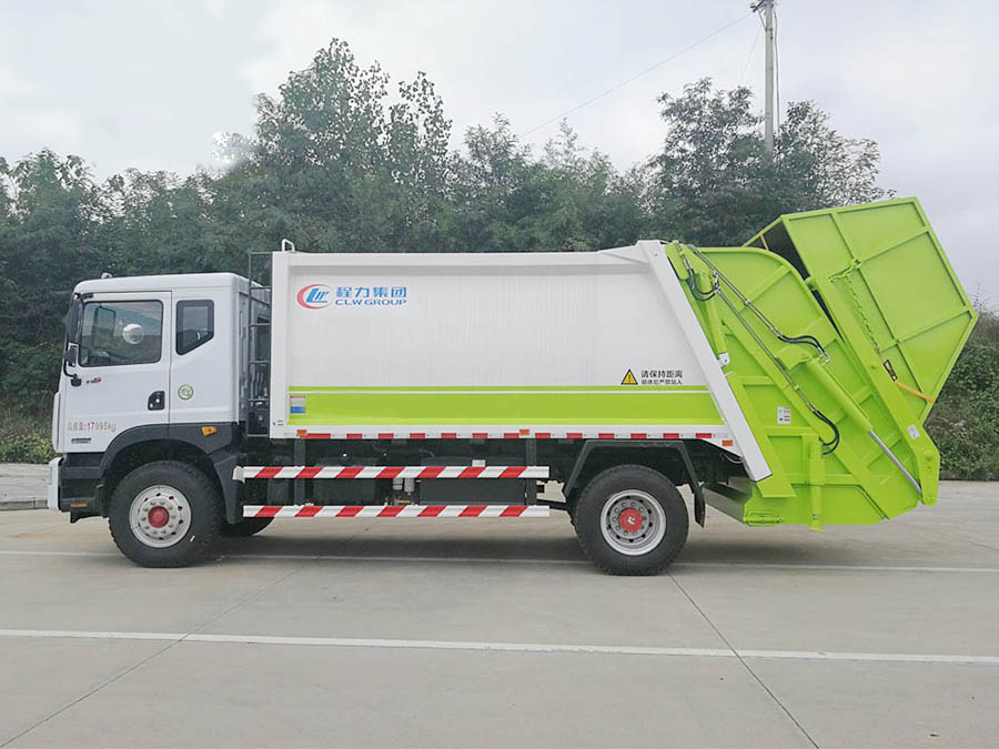 12方东风D9压缩式垃圾车,弧形箱体,容积约10-12立方,可装垃圾8-10吨,采用特种钢板制作,箱体底板5mm,边板5mm,厦门银华油缸,江苏多路阀,长源液压油泵,填装器举升油缸带液压锁装置,采用进口西门子PLC电控系统(带一键操作,和手动操作两种控制方式),电控操作盒三只。带3个污水收集箱,尾部带橡胶密封条。填充器加装后照明灯,箱体油漆及喷字按用户要求定制。