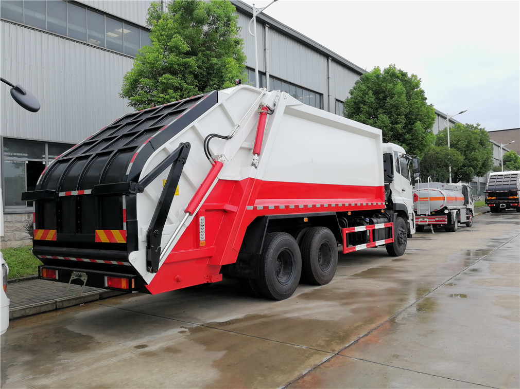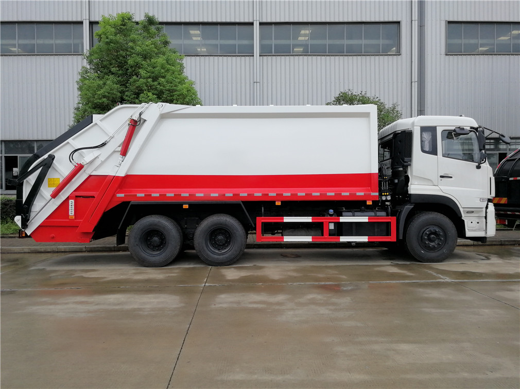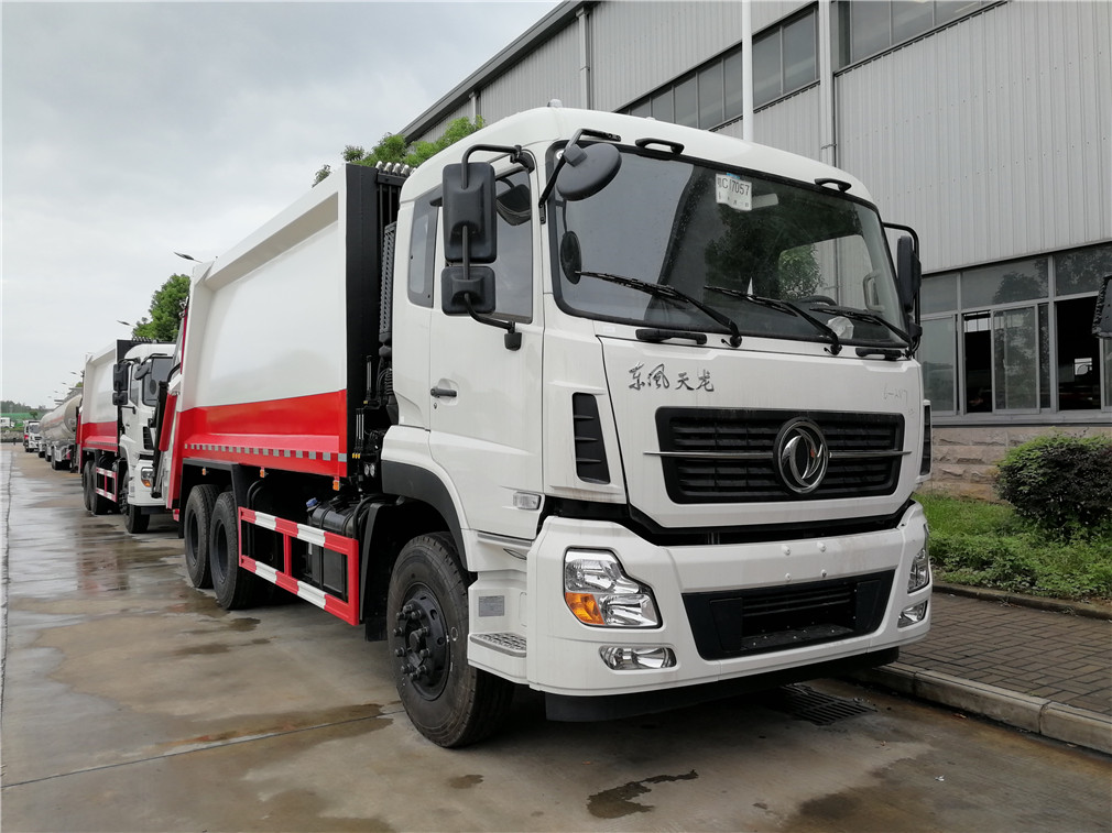 东风天龙20方压缩式垃圾车,弧形箱体,容积约18-20立方,可装垃圾15-17吨,采用特种钢板制作,箱体底板6mm,边板6mm,厦门银华油缸,江苏多路阀,长源液压油泵,填装器举升油缸带液压锁装置,采用进口西门子PLC电控系统(带一键操作,和手动操作两种控制方式),电控操作盒三只。带3个污水收集箱,尾部带橡胶密封条。填充器加装后照明灯,箱体油漆及喷字按用户要求定制。