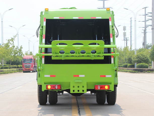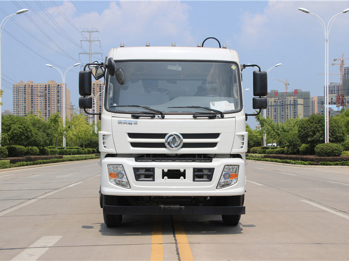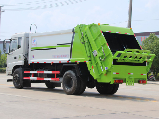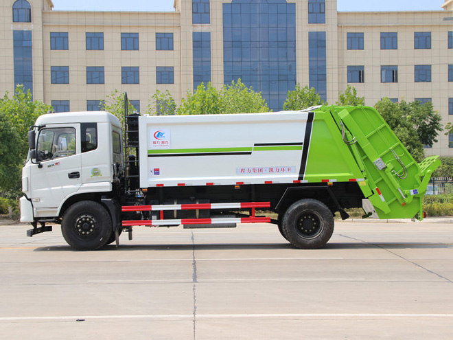 东风御虎12方压缩式垃圾车,弧形箱体,容积约10-12立方,可装垃圾8-10吨,采用特种钢板制作,箱体底板5mm,边板5mm,厦门银华油缸,江苏多路阀,长源液压油泵,填装器举升油缸带液压锁装置,采用进口西门子PLC电控系统(带一键操作,和手动操作两种控制方式),电控操作盒三只。带3个污水收集箱,尾部带橡胶密封条。填充器加装后照明灯,箱体油漆及喷字按用户要求定制。