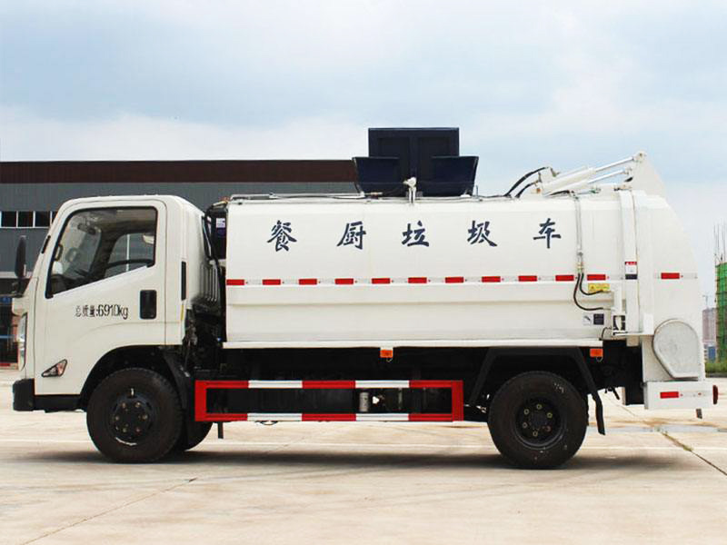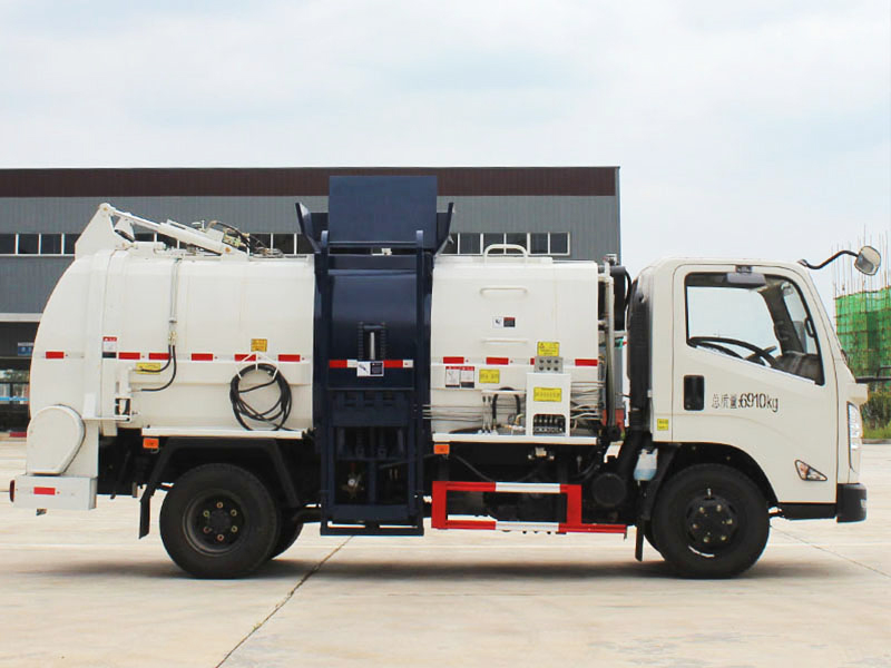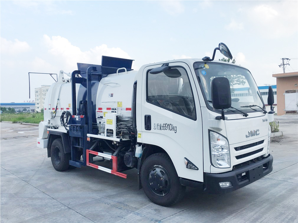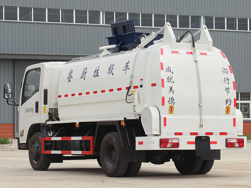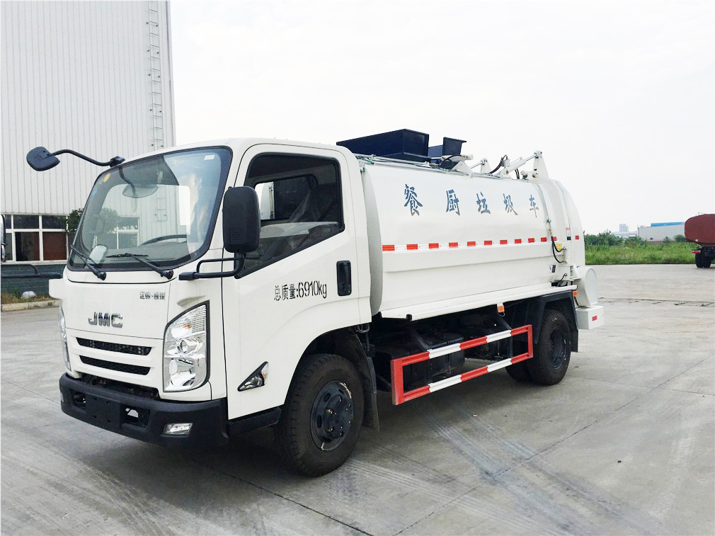 5方江铃餐厨垃圾车,全新款式箱体工艺,有效容积5立方米,车身右侧配液压挂桶提升机构,可挂国标120/240升垃圾桶,液压完成提桶倾倒作业,尾门为液压开启锁闭装置,可保证滴水不漏,箱体内部设有液压推板,可装垃圾推出卸料,带固液分离装置,标配液压马达带高压柱塞泵,配移动高压清洗枪。选装密闭式绞龙卸料装置、选装不锈钢材质箱体、选装罐内加热装置。