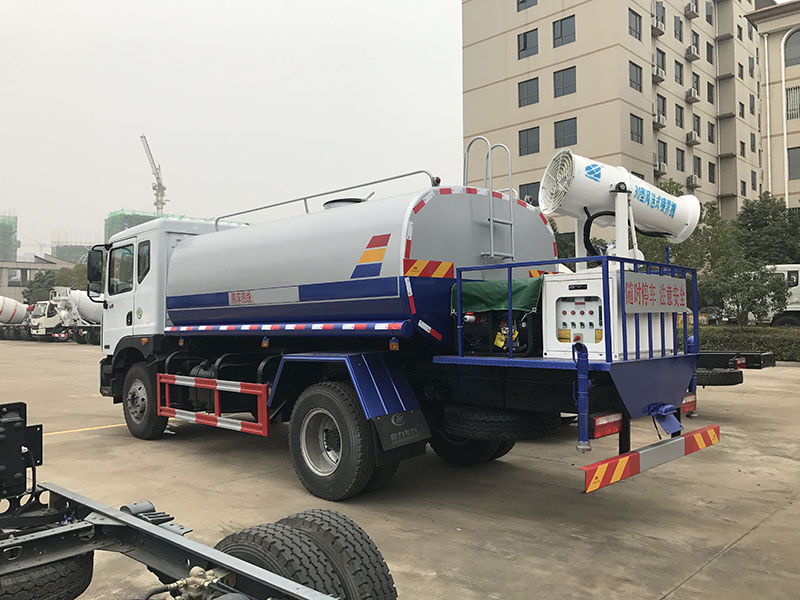 东风多利卡D9洒水车,采用杭州威龙大功率专用洒水泵,可自吸自排,垂直吸程为7米,水流量为60立方米/小时,扬程90米,配备前冲、后洒、测喷,尾部工作平台、平台高压水炮等。